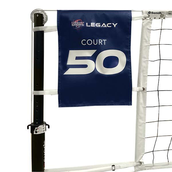 The custom volleyball net court label easily attaches to your volleyball net and may be fully customized to represent your volleyball team, volleyball club, school, or volleyball facility. The volleyball court marker is perfect for volleyball facilities or schools with multiple courts needing to number or mark their courts. Our in house graphic designer will provide your volleyball team with mockups for review and selection. Custom font, colors, and a team logo are all options to fully customize your volleyball net court label.