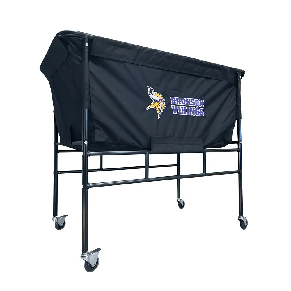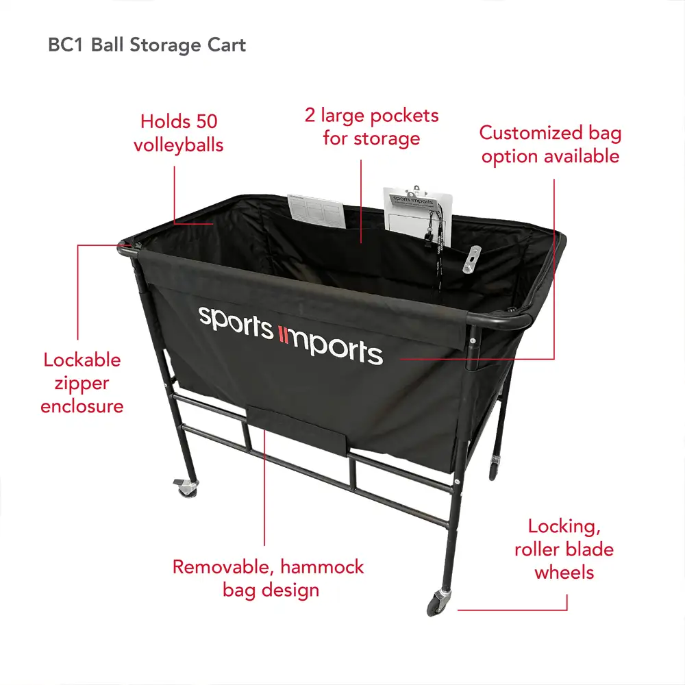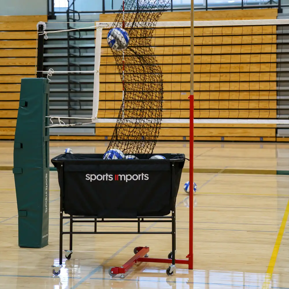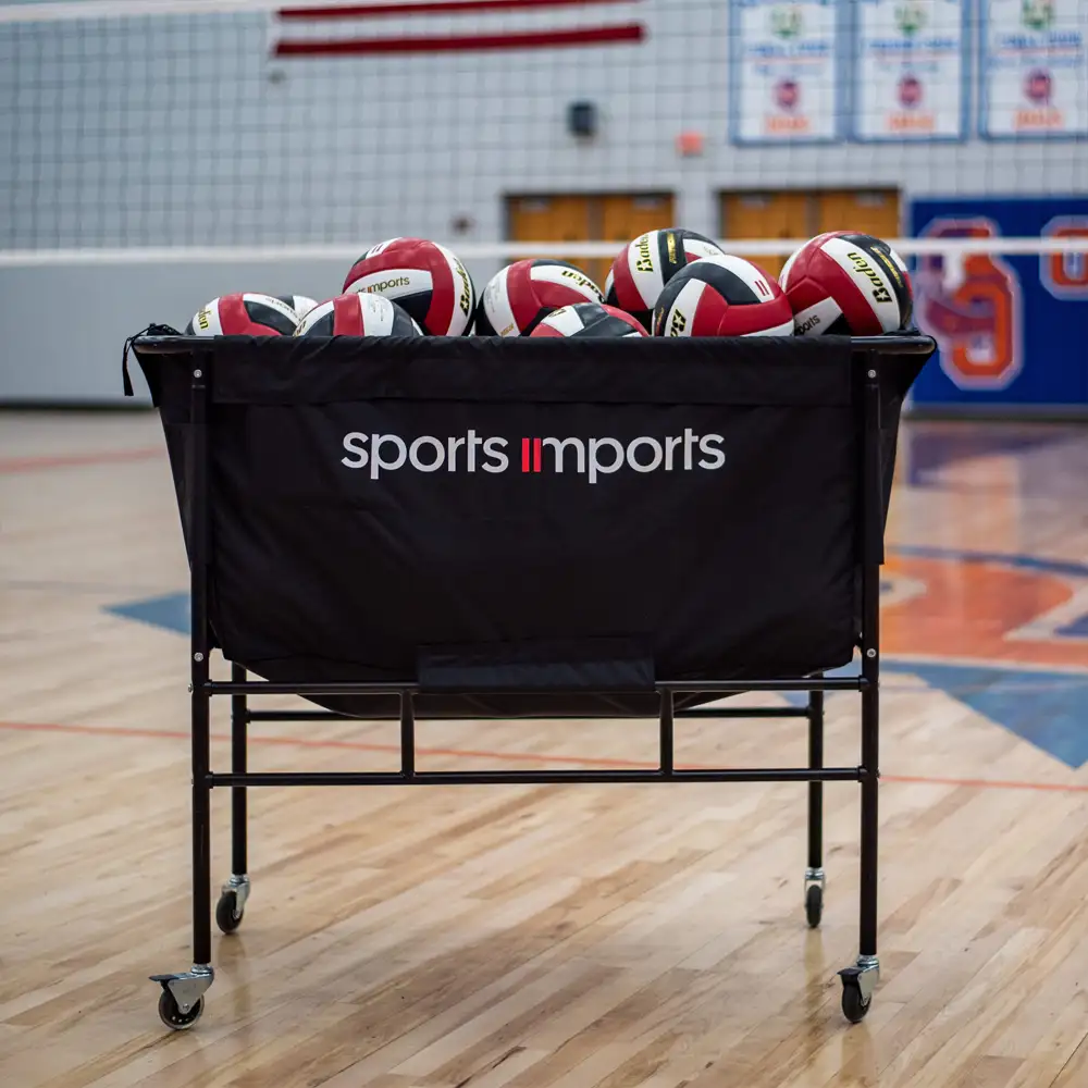 Redesigned to include upgraded features, the BC1 Volleyball Ball Cart is the premium quality you expect from Sports Imports with easier set-up and seamless mobility. The new rollerblade-style lockable wheels allow for the cart to glide easily across the gym without damaging the floor. The lockable zipper bag can hold 50 volleyballs and can be removed via the hook and loop attachments. The Sports Imports Ball Cart has a hooded hammock design that allows for balls to rest on top of the cart, keeping balls hip high for easy retrieval. Our ball cart also has two large pockets on the inside that can store crank handles or coaching accessories. The dimensions of the volleyball cart are 46” x 25” x 39” tall. Pair with the Trainer+ to easily catch balls during target drills.